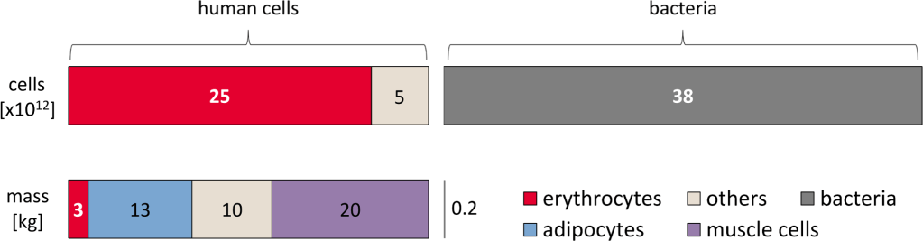 Although blood cells are the most numerous cells in numbers, by weight they are far exceeded by fat cells and muscle cells. The total mass of blood cells in a 70-kg adult male is estimated at 3kg. Interestingly, there are more bacteria on the human body compared to any human cells.