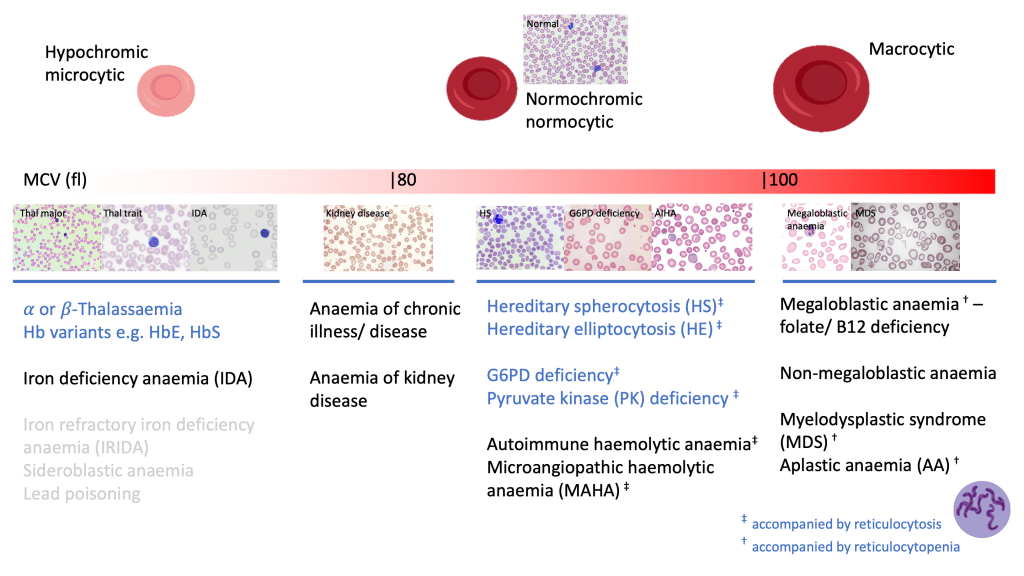 The other full blood count (FBC) parameters such as red blood count (RBC), red distribution width (RDW) and reticulocyte count, provides further useful information to narrow the cause of the anaemia. The figure below illustrates the differential diagnosis for the cause of anaemia, inferred from MCV and whether there is accompanying reticulocytosis or reticulocytopenia.