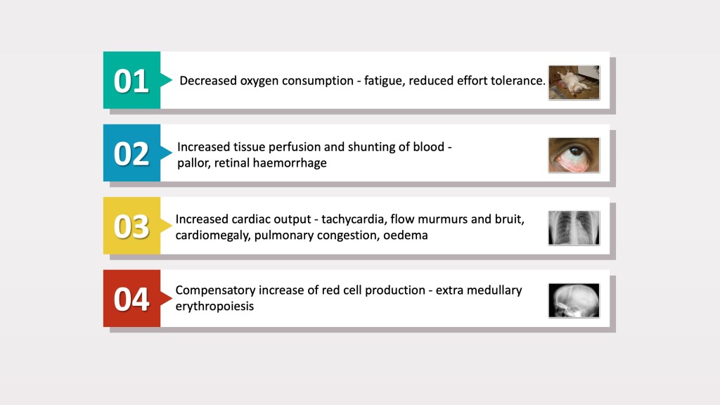 Clinical symptoms associated with anaemia usually develop when the bone marrow is unable to compensate for the haemoglobin drop. In order to ensure continued delivery of oxygen, sufficient for organ demands, cardiac output needs to be increased. This is reflected in a hyper-dynamic circulation as evidenced by tachycardia, cardiac murmurs and in extreme cases, decompensated congestive cardiac failure. Reduction in tissue oxygen delivery may result in lethargy, poor effort tolerance and reduced cognition. Vasoconstriction of peripheral blood vessels in order to maintain circulation and oxygen delivery to central organs such as the heart and brain, results in the physical appearance of pallor.