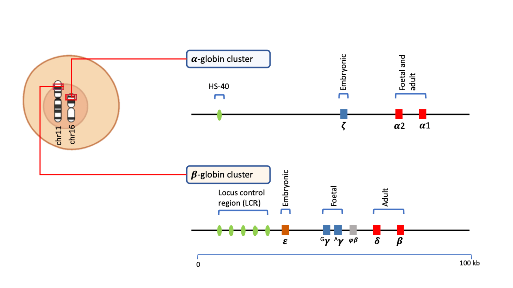 The globin component of the haemoglobin molecule meanwhile is structured on a pair of globin dimers. The globin chains are transcribed and translated from a group of genes within the πΆ-globin and π·-globin cluster on chromosome 16 and 11 respectively.