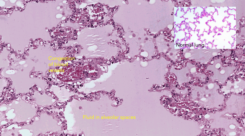 Pulmonary oedema is a condition in which fluid accumulates within the normally air-filled alveolar space resulting in impaired pulmonary gas exchange. This usually results from increased hydrostatic pressure in the pulmonary venous circuit.