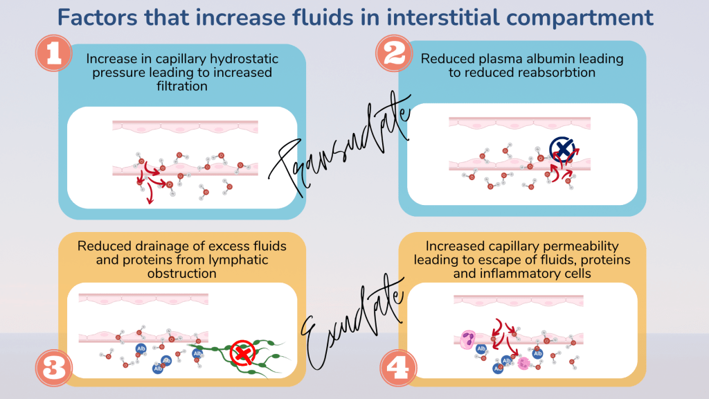 Increased hydrostatic pressure within the capillaries causes excessive net movement of fluids from the capillaries into the interstitial compartment. This causes fluid to accumulate in the interstitial space causing oedema.