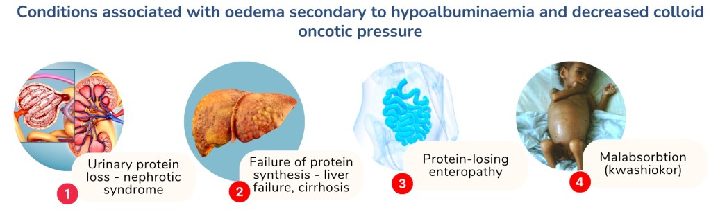 Intravascular oncotic pressure is mainly contributed by plasma albumin. Therefore, conditions that cause low plasma albumin i.e. hypoalbuminaemia can result in net filtration increase, as there is not enough colloid oncotic pressure to reabsorb fluid into the circulation.