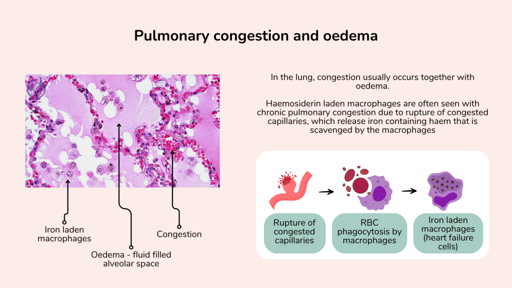 In addition to the engorged dilated pulmonary blood vessels due to congestion, and fluid filled alveolar spaces associated with pulmonary oedema one may also appreciate the presence of haemosiderin laden macrophages in chronic pulmonary congestion.