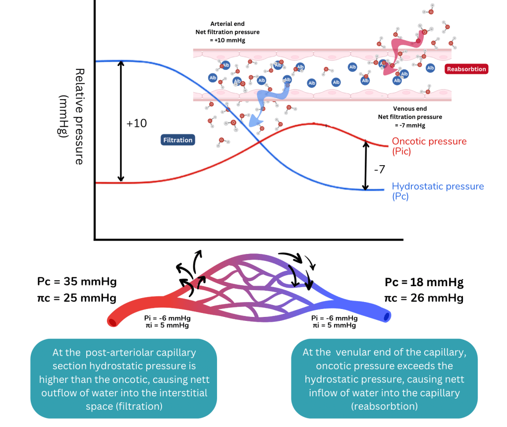 It should be emphasised that the shifts in fluid is a dynamic process and the net capillary filtration rate is determined by local conditions, with the opposing actions of hydrostatic and oncotic forces within and outside the capillaries as explained by Starling’s hypotheses.