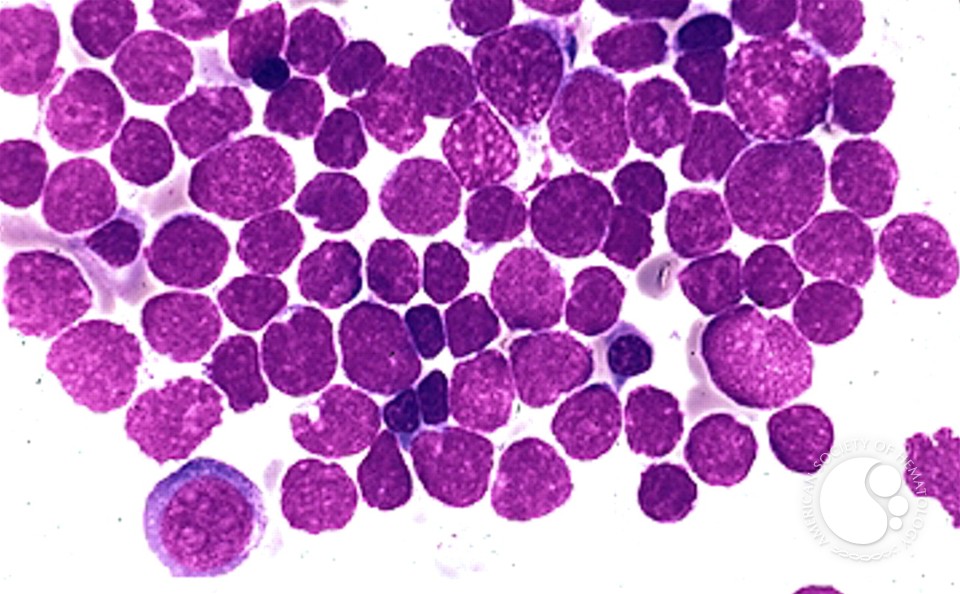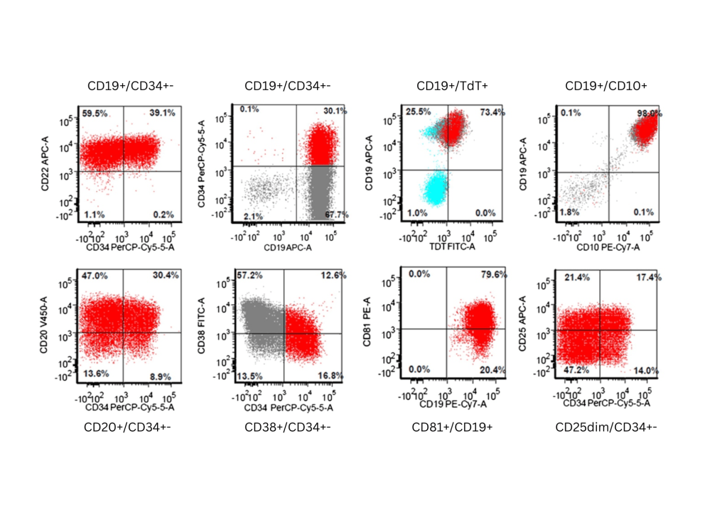 The lymphoblasts express B-lineage markers CD19, CD20, CD22, immature markers CD34, TdT, CD10, and aberrant CD25. They are aberrantly dim for CD38 and CD81. Immunophenotypic features is consistent with a B-lymphoblastic leukemia.