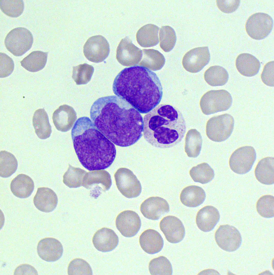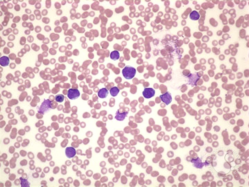 Platelets are reduced in numbers. White cells show neutropenia with left shifted maturation. Most of the cells see are composed of blasts with scanty bluish cytoplasm and occasional conspicuous nucleoli.