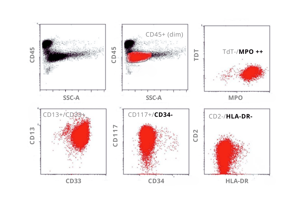 Flow cytometry show cells with absence of HLA-DR and CD34 and expression of CD13, CD33, and CD117; immunophenotypic features are that of acute promyelocytic leukemia.