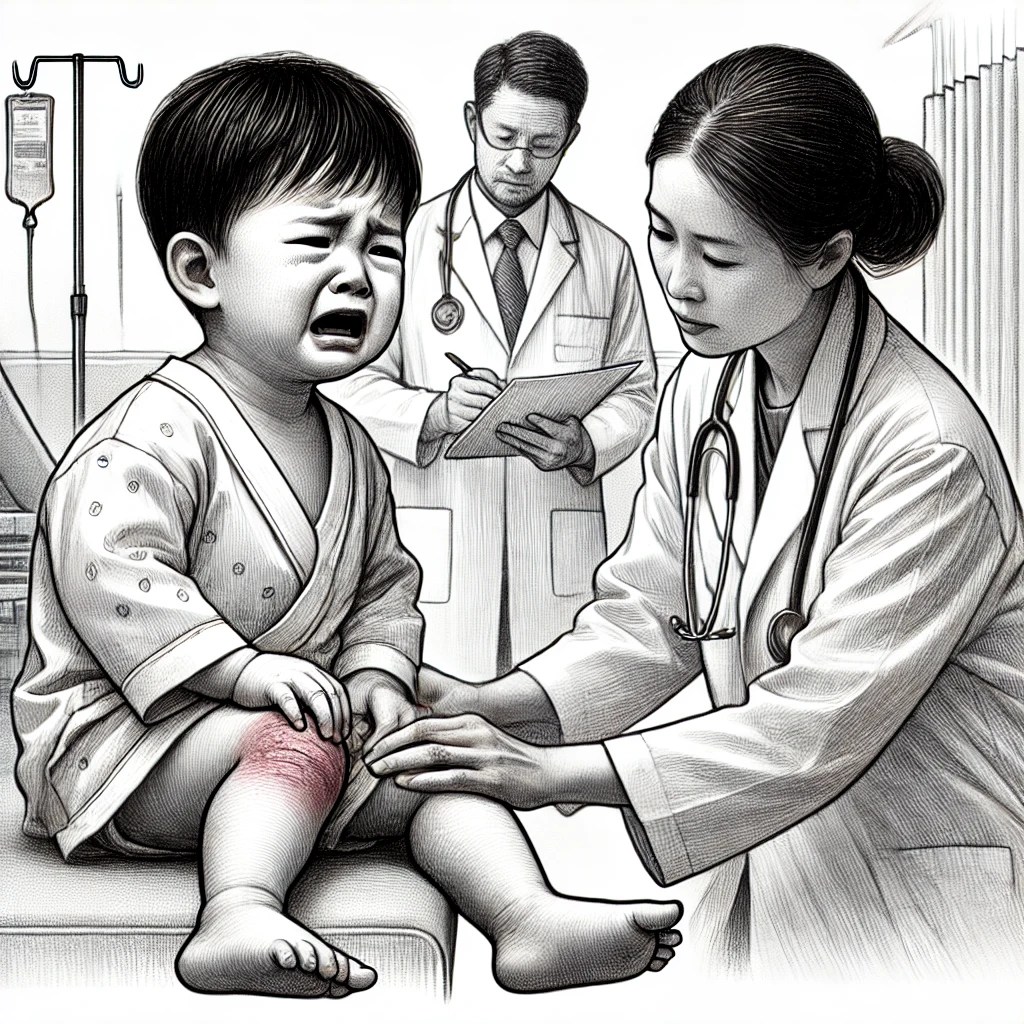 Sean Chiew is a 14-month-old boy. His mother brings him to the Emergency Department because Sean was noted to be limping with a right swollen knee, which seems to be progressively increasing in size over the past couple of hours.