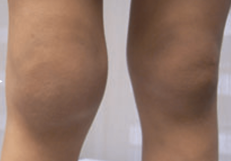 The right knee was swollen with loss of the knee contours. The overlying skin was warm to touch and tender. Range of movement was limited and was noticeably painful on extension. No muscle wasting was evident and the other joints were normal.